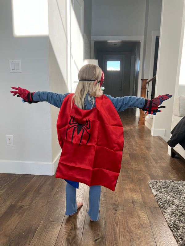 The bundle includes Two web shooters, 2 hero masks,2 gloves, cape, and soft foam web darts — everything needed for full superhero play right out of the box.